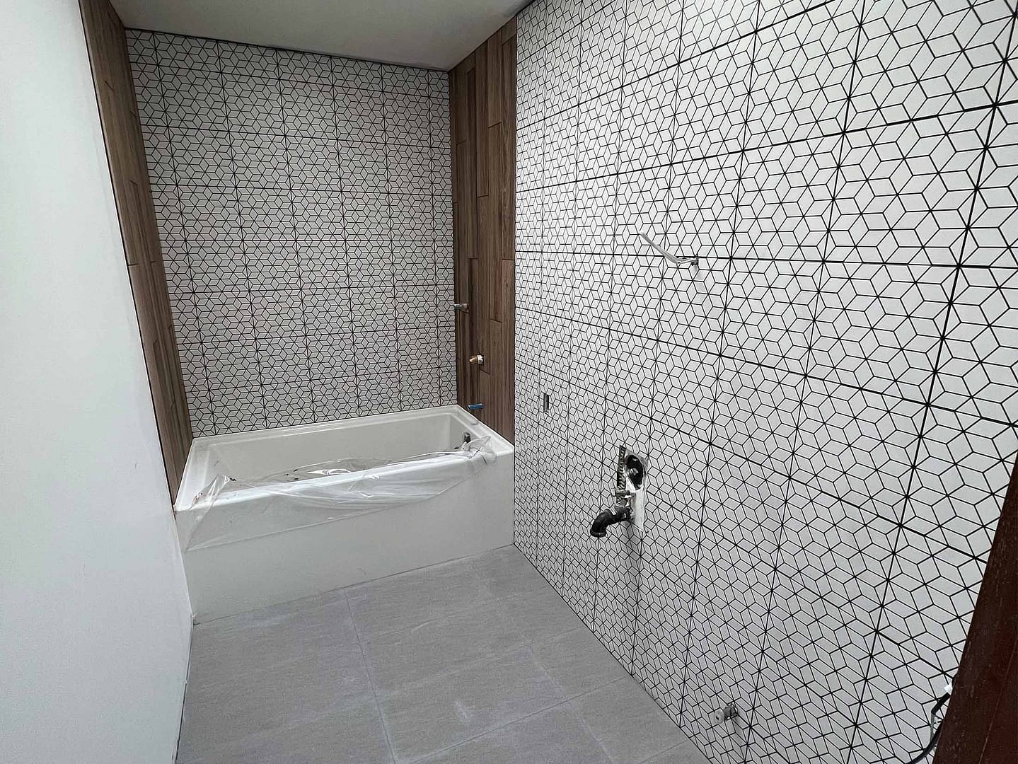 An unfortunate leak allowed the homeowner to turn this into a beautiful, updated bathroom. The old hydronic floor heating had to be eliminated, and looped, and a new heat mat was installed for comfort. The floor to ceiling tiles, with their geometric shape really bring this bathroom to life.