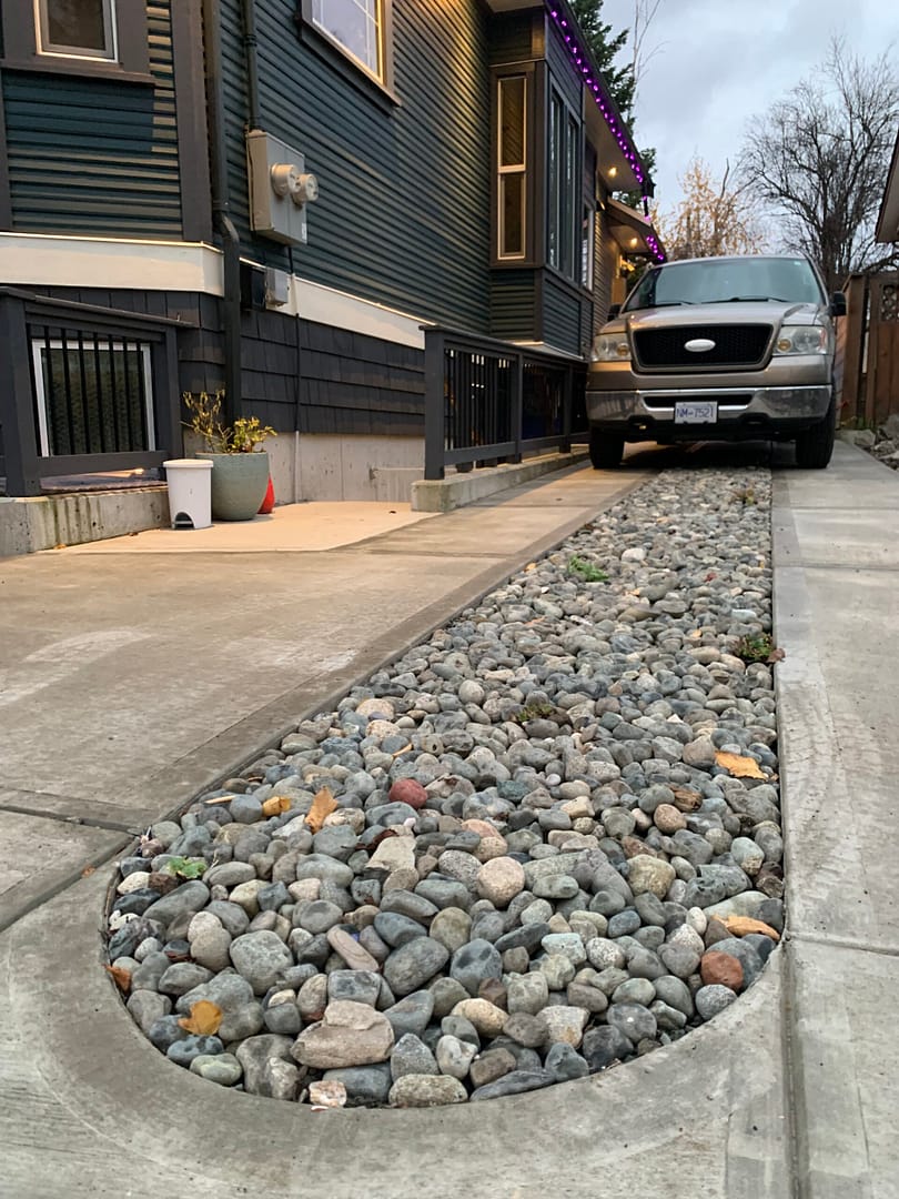 Seeking a balance of originality and everyday function, this custom driveway was designed in close collaboration with the homeowners. At its center, a planted strip has been thoughtfully integrated, intended to gradually fill in with succulents, greenery, and seasonal flowers, softening the hardscape over time.